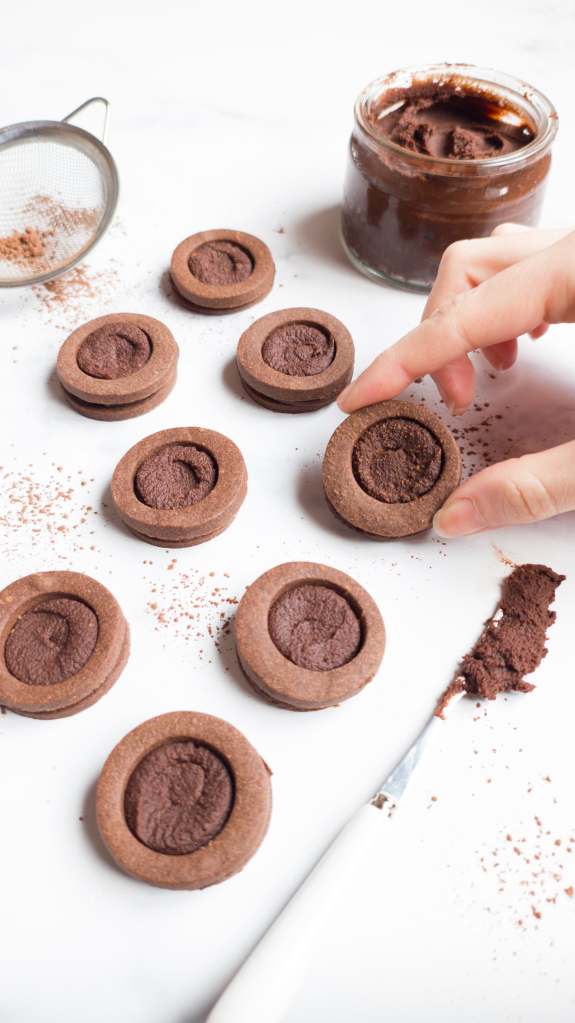- Una vez que la ganache de chocolate este bien cremosa, pasarla a una manga pastelera, y rellenar las tapitas.
