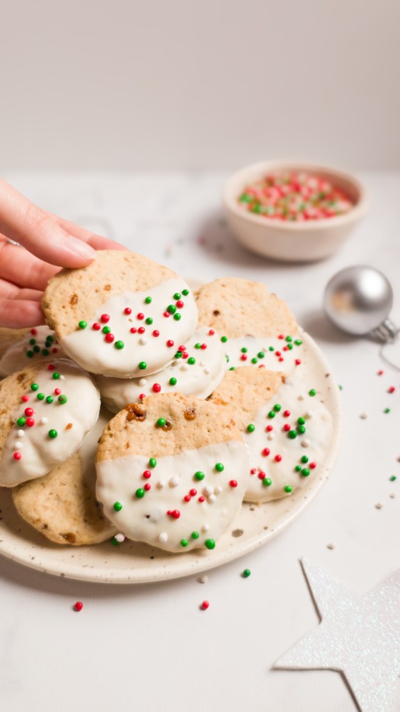 - Una vez frías las galletitas, bañar con el chocolate derretido hasta la mitad. Escurrir y dejar secar sobre una plancha de papel manteca o de silicona. Decorar con los sprinkles navideños por encima, antes de que se seque el chocolate.